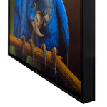 The hyacinth macaws, the largest parrots in the world, are native to central and eastern South America. These affectionate birds mate for life, and reinforce their bond by preening each other's feathers, sharing food, and roosting together. They possess the ability to problem solve and an intelligence level comparable to that of a human toddler. The hyacinth macaws are vulnerable to extinction due to habitat loss and over-collection for the pet trade.