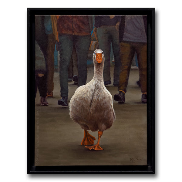 There is something about this scene that captivates me. It represents the way all wildlife creatures strive to survive in spite of all odds–more specifically, in spite of us. We all want the same thing: to live our full lives; but we only have one planet to share and we are not very good at sharing. With each passing year there’s more of us and less of them. The ratio is changing in an alarming rate, and that’s what this lonely goose represents, walking alone in front of a sea of people on a busy sidewalk.