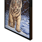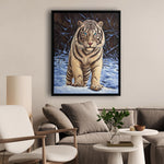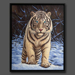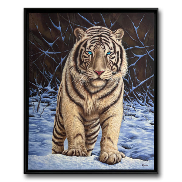I have been an avid animal lover my whole life, and painting animals brings me so much joy and comfort. I am fascinated by the characteristics of each species that I paint. I find it both challenging and exciting to capture their unique beauty and tell their stories with my brush strokes. I especially enjoyed painting the gaze of this white bengal tiger, one of the most beautiful animals in the world, stepping over a fallen tree in a snowy forest. Truly majestic.